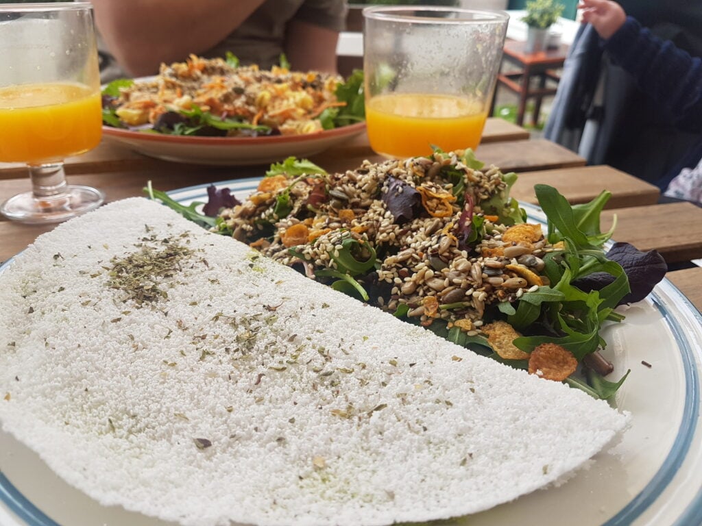 For tapioca crepes (similar to the one pictured below), this dedicated gluten free spot is an excellent choice. Ideal for a speedy lunch. They offer sweet and savoury tapioca crepes, acai bowls, salad bowls and steak.
