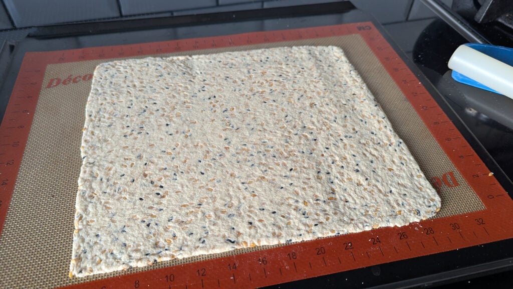 For these gluten free sourdough discard crackers I use gluten free sourdough starter, water, whole blond psyllium husk, cornflour (corn starch), golden linseed, black sesame and parmesan. With a little olive oil and salt to finish.